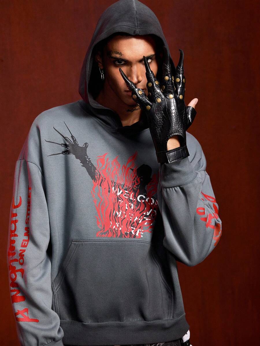 A Nightmare on Elm Street X ROMWE Felpa con cappuccio da uomo con grafica vintage lavata, autunnale