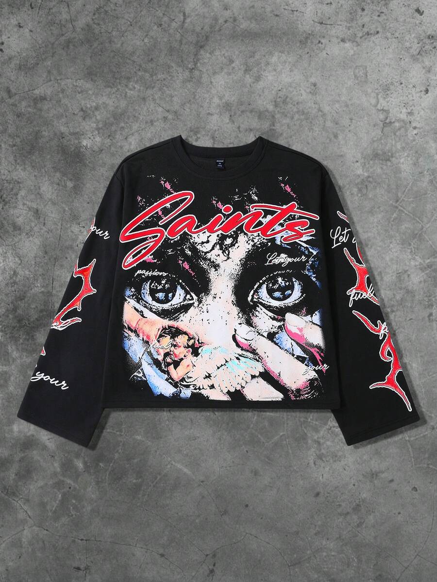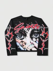 Street Life Maglietta oversize nera da uomo con motivo a fiamma e strass rotondi, streetwear per uso casual quotidiano, autunno