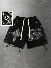 Pantaloncini casual da uomo con vita con coulisse, grafica con lettere e strass, versatili per uso quotidiano