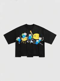 Adventure Time X ROMWE T-shirt da uomo a maniche corte con stampa asimmetrica e effetto patchwork, vestibilità morbida e corta