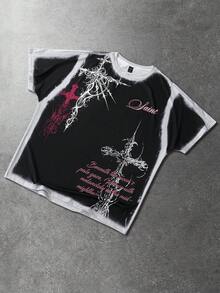 maglietta casual da uomo, stile moda di strada punk, con stampa di croci e slogan, lavata, a maniche corte, estiva