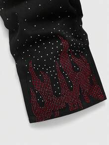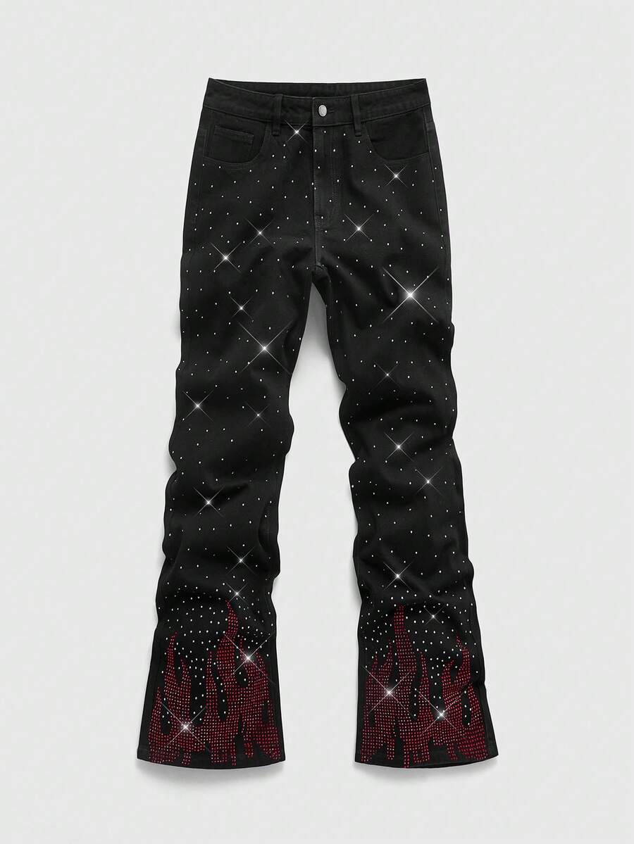 Jeans casual da uomo con tasche e design a fiamma con strass