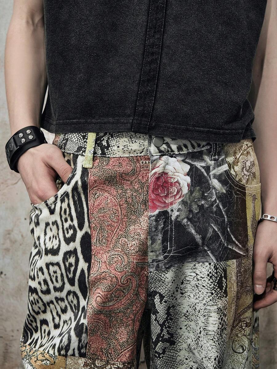 Jeans casual da uomo con stampa a patchwork, tasche inclinate e gamba dritta