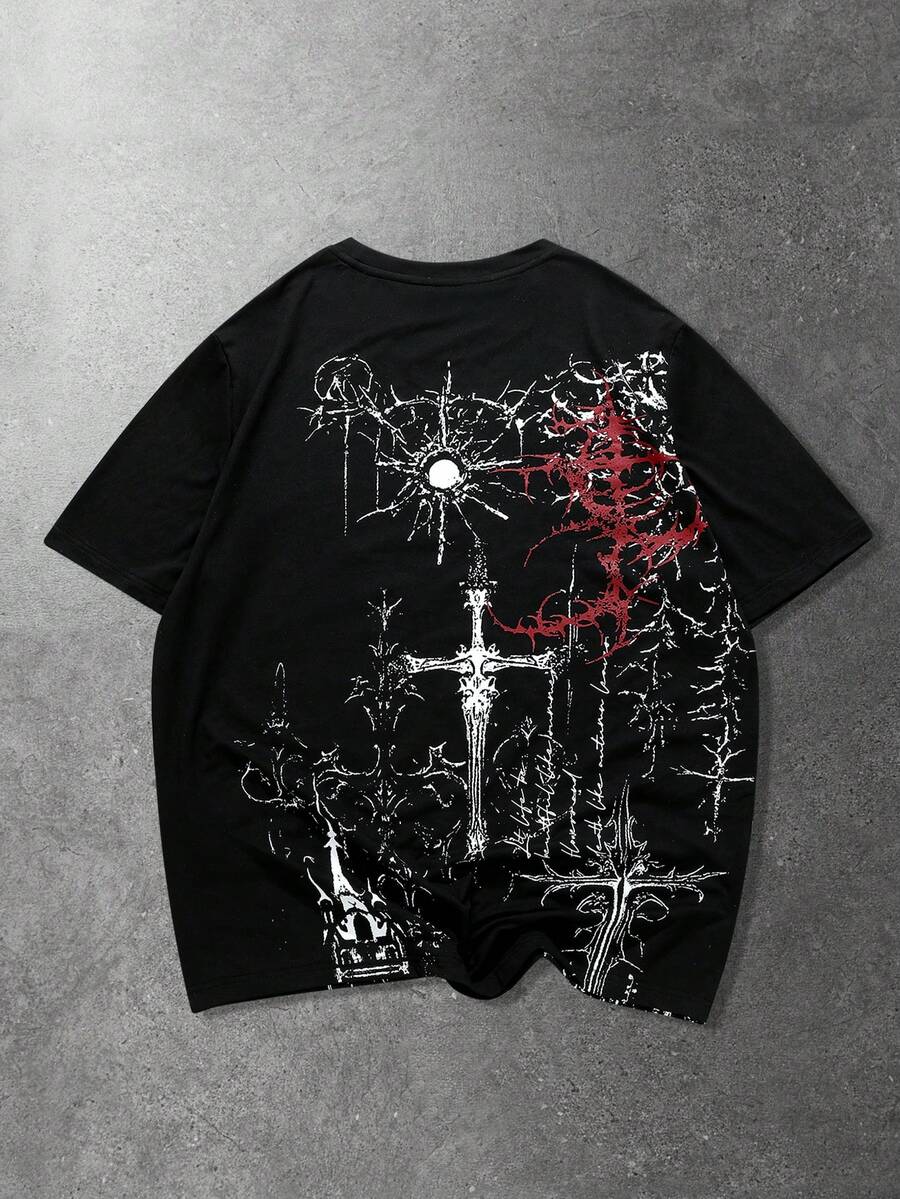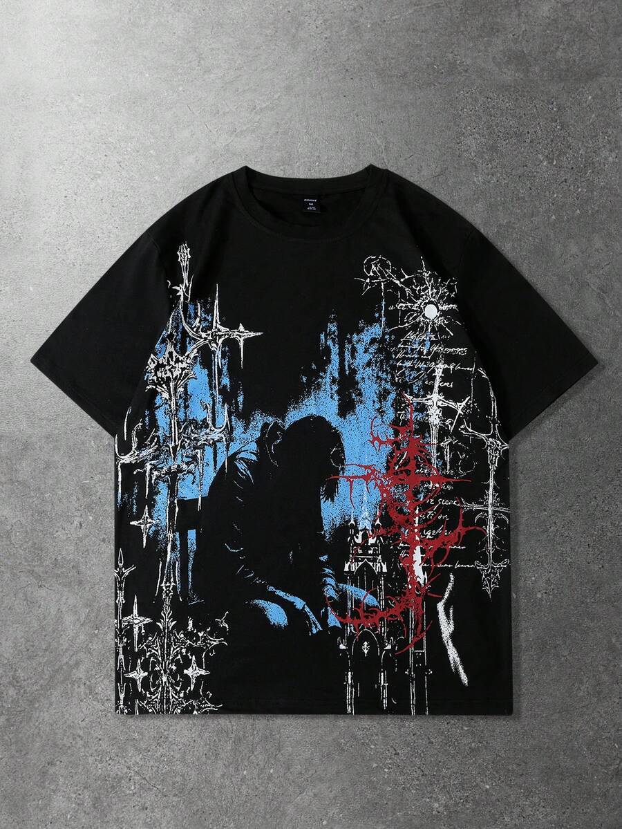 Maglietta casual da uomo a maniche corte con stampa dettagliata scura di stile americano di strada