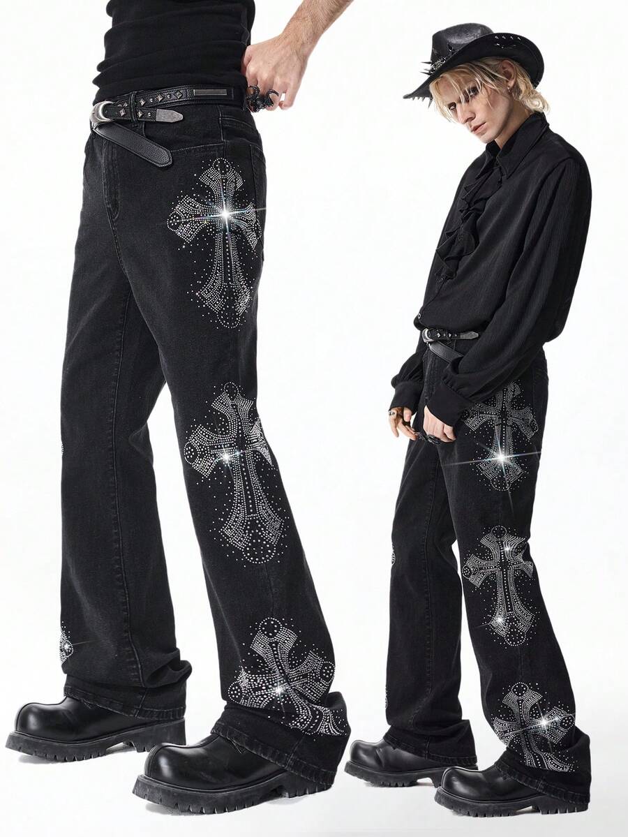 Jeans casual da uomo lavati con applicazioni di strass a forma di croce