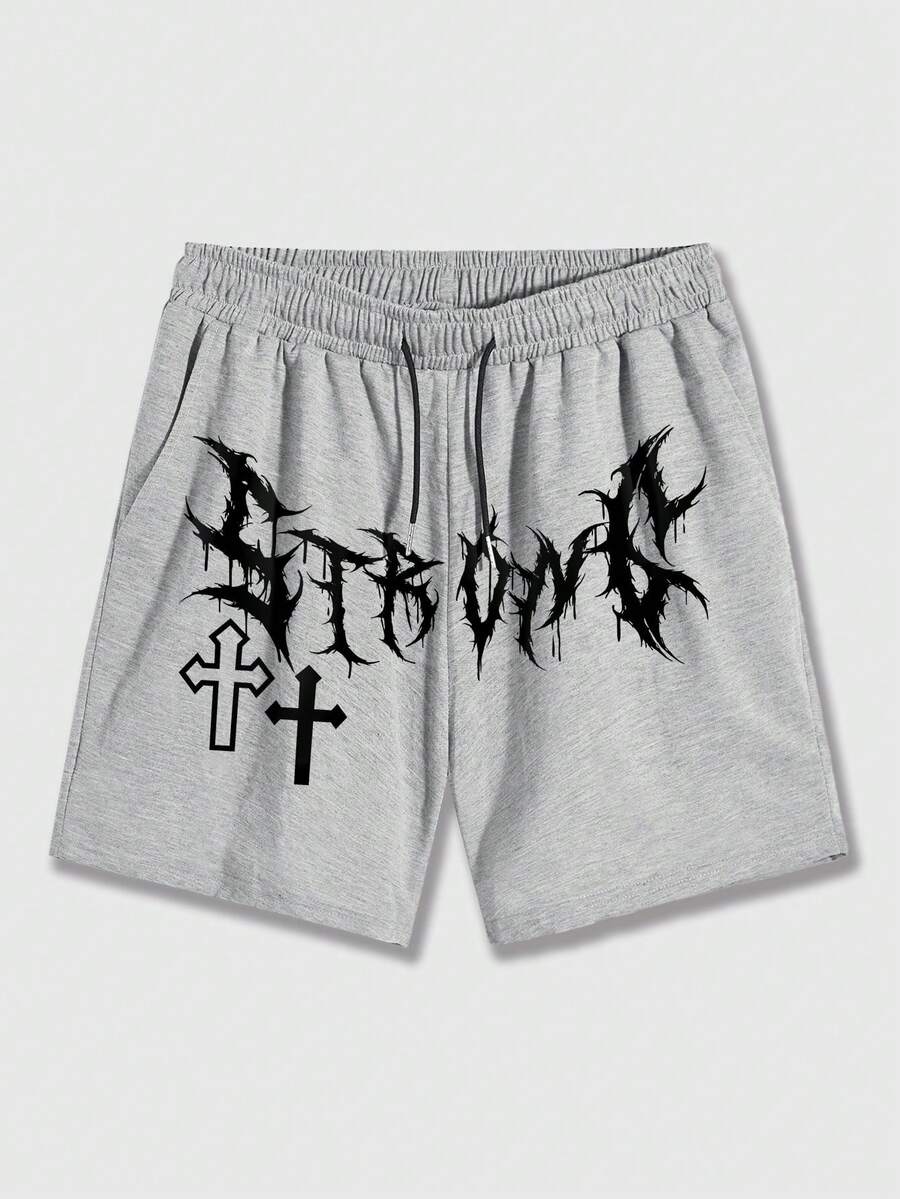 Goth Pantaloncini casual da uomo con stampa a croce e lettera gotica, con coulisse in vita e tasche