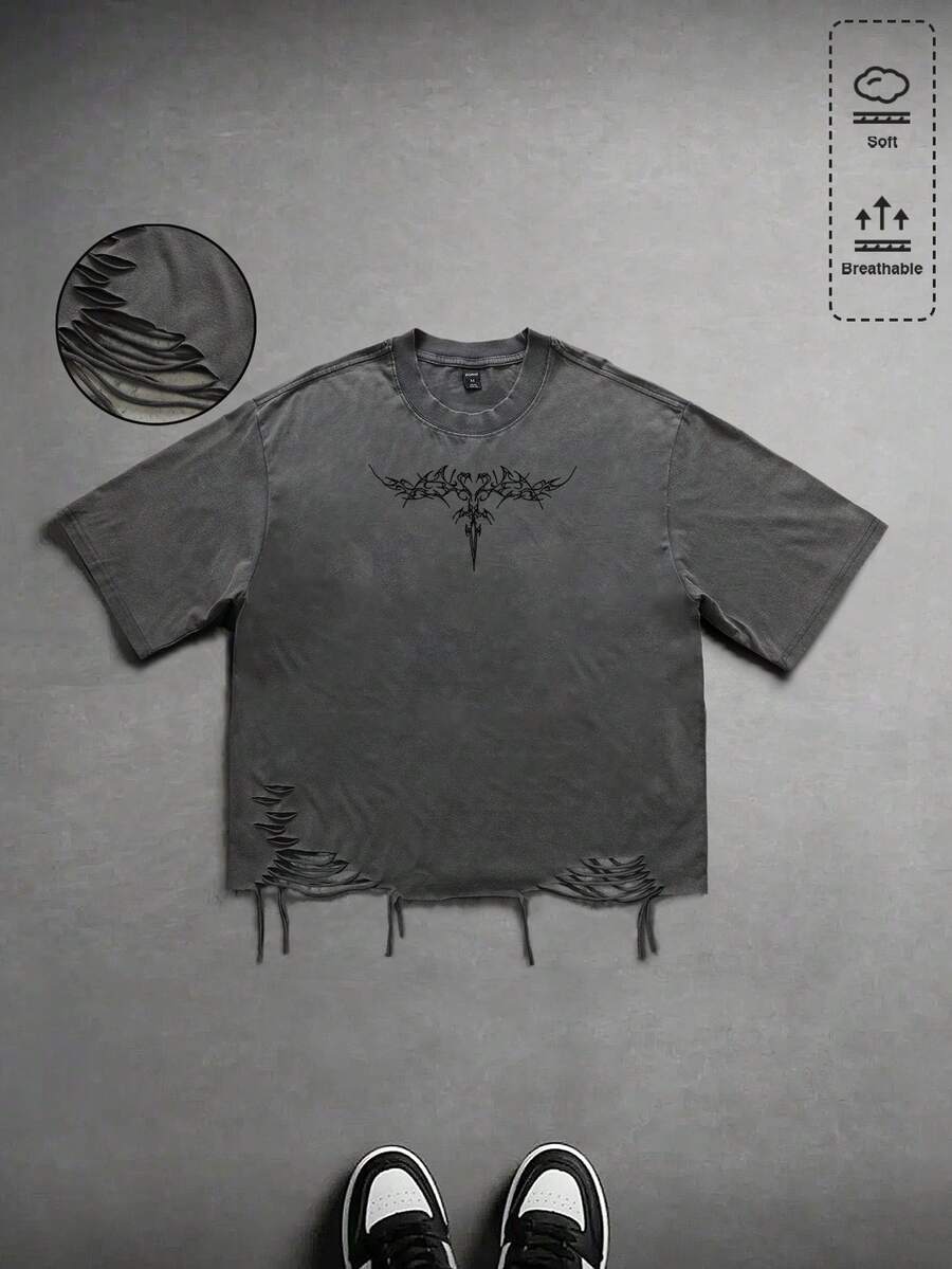 Maglietta oversize stile streetwear, lavata e strappata, effetto vissuto, da uomo