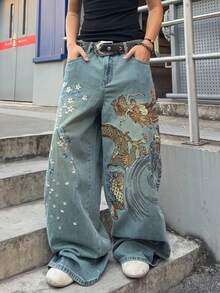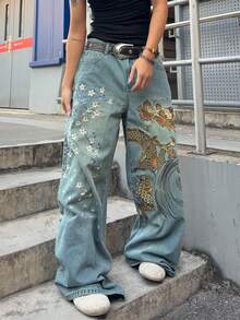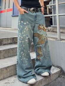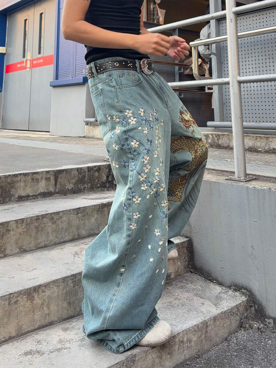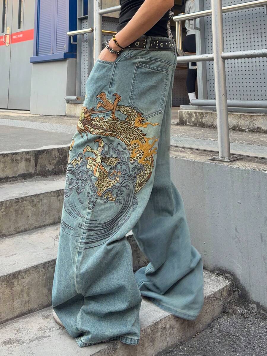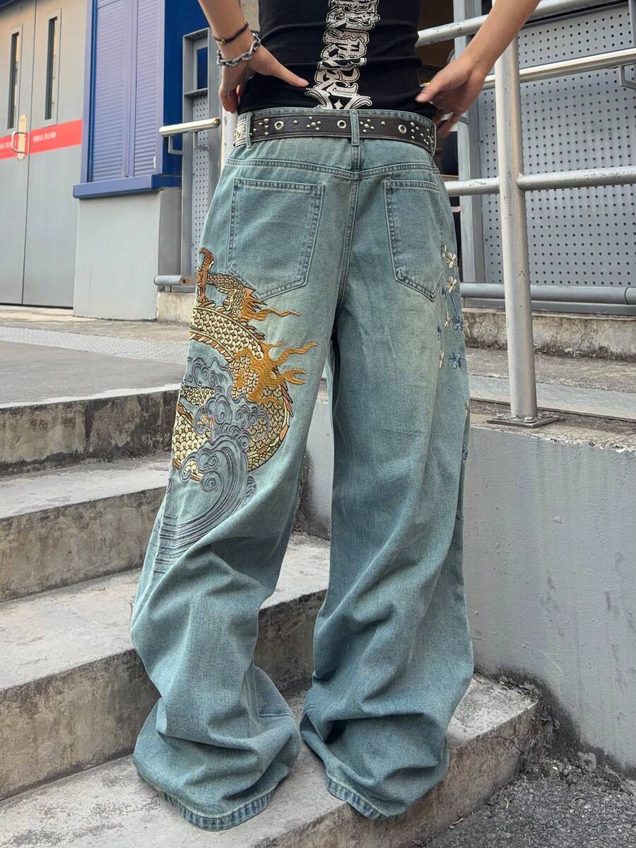 Jeans ampi da uomo con ricamo floreale e motivo del drago