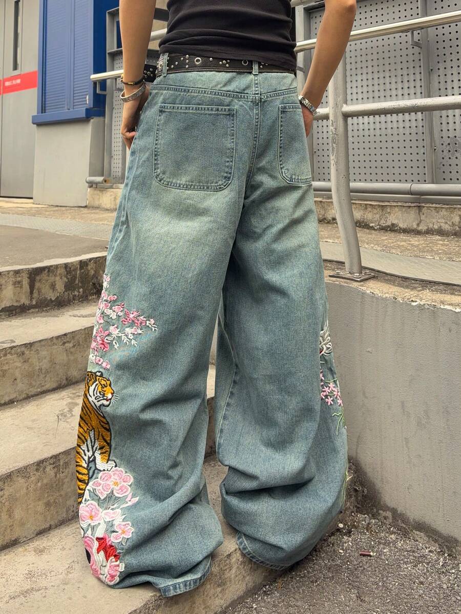 Jeans ampi da uomo con ricamo floreale e di tigre