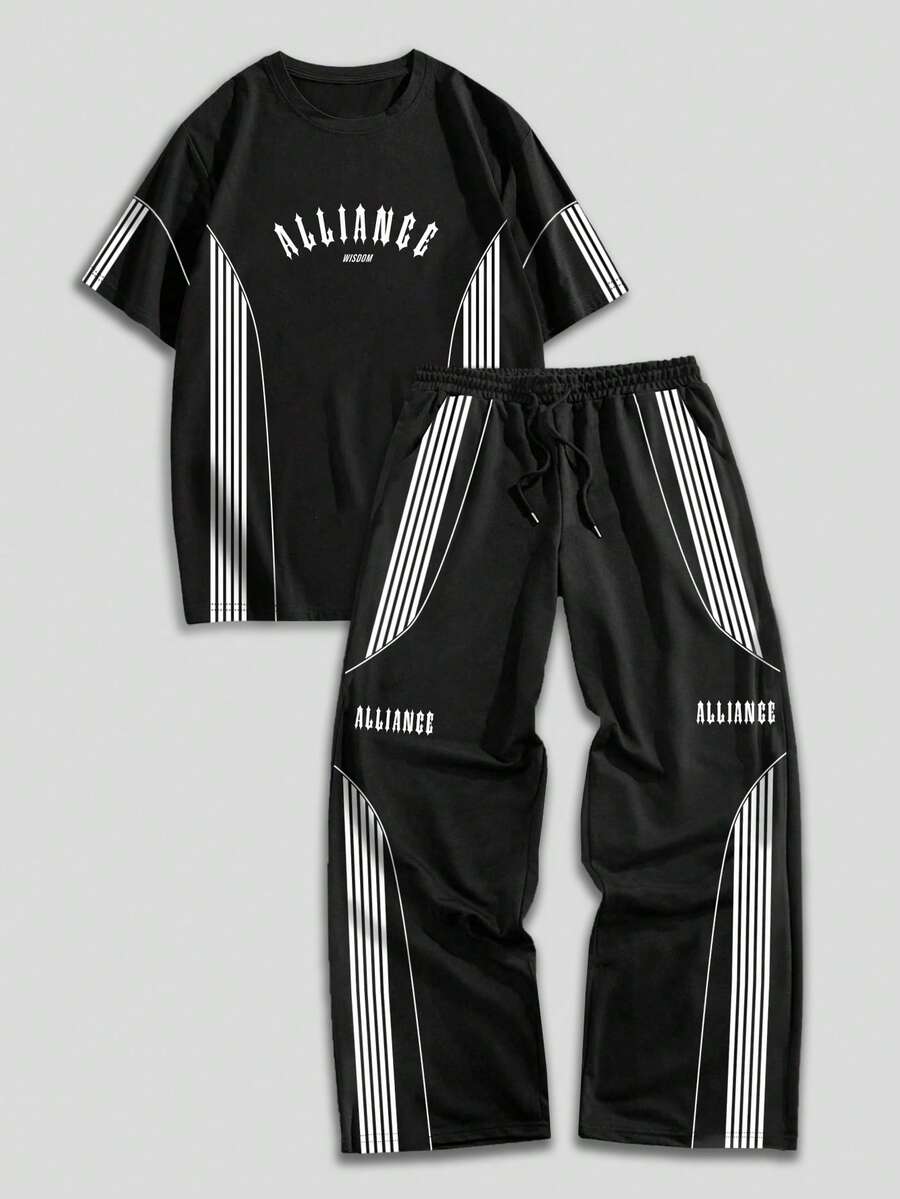 Set di t-shirt a maniche corte con scollo rotondo con lettera e righe e pantaloni casual con vita con coulisse per uomo
