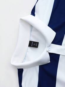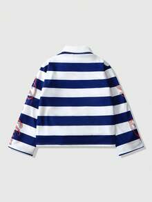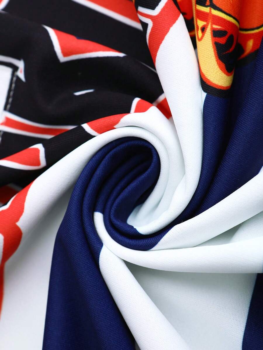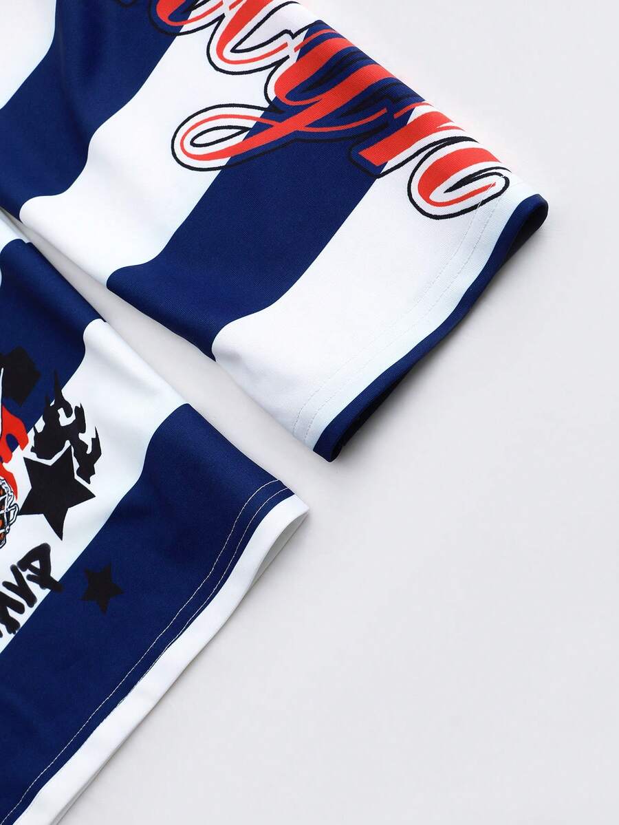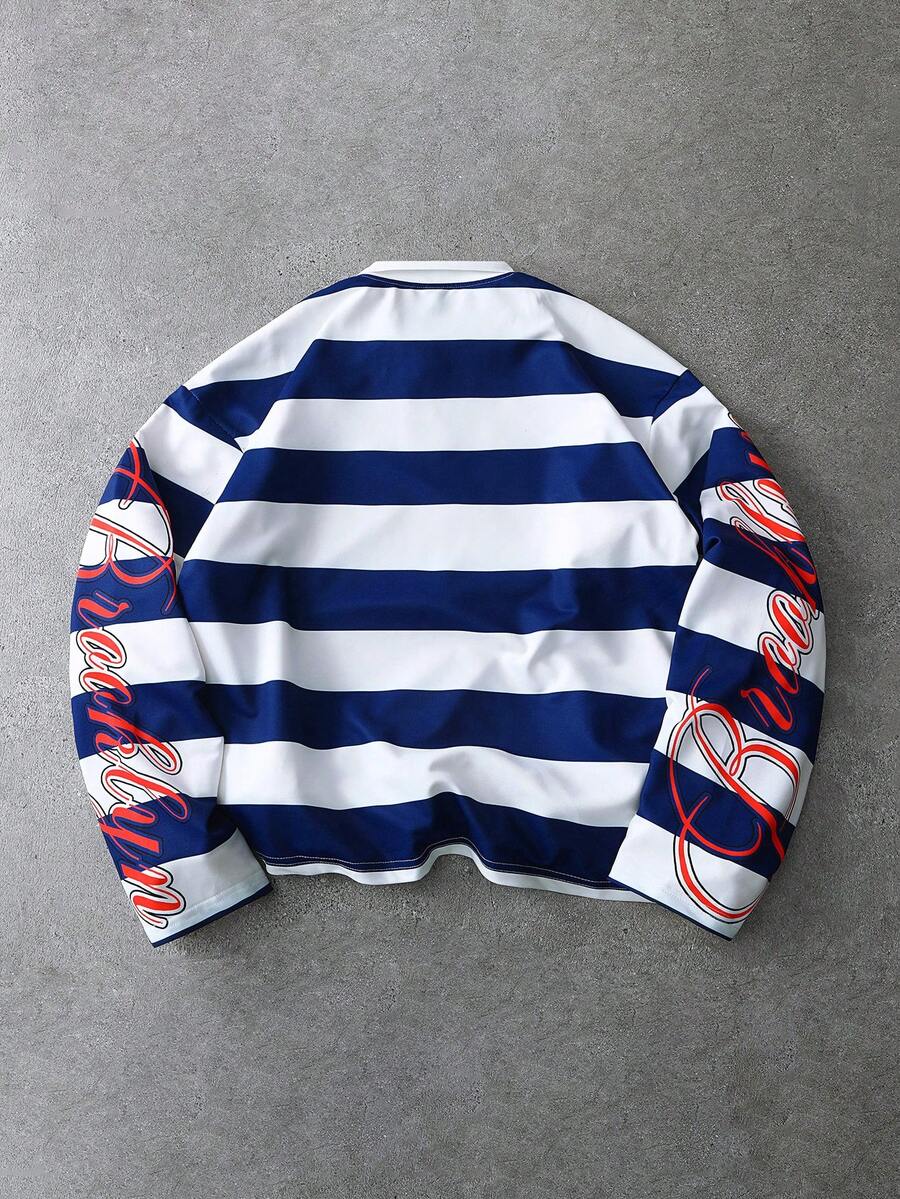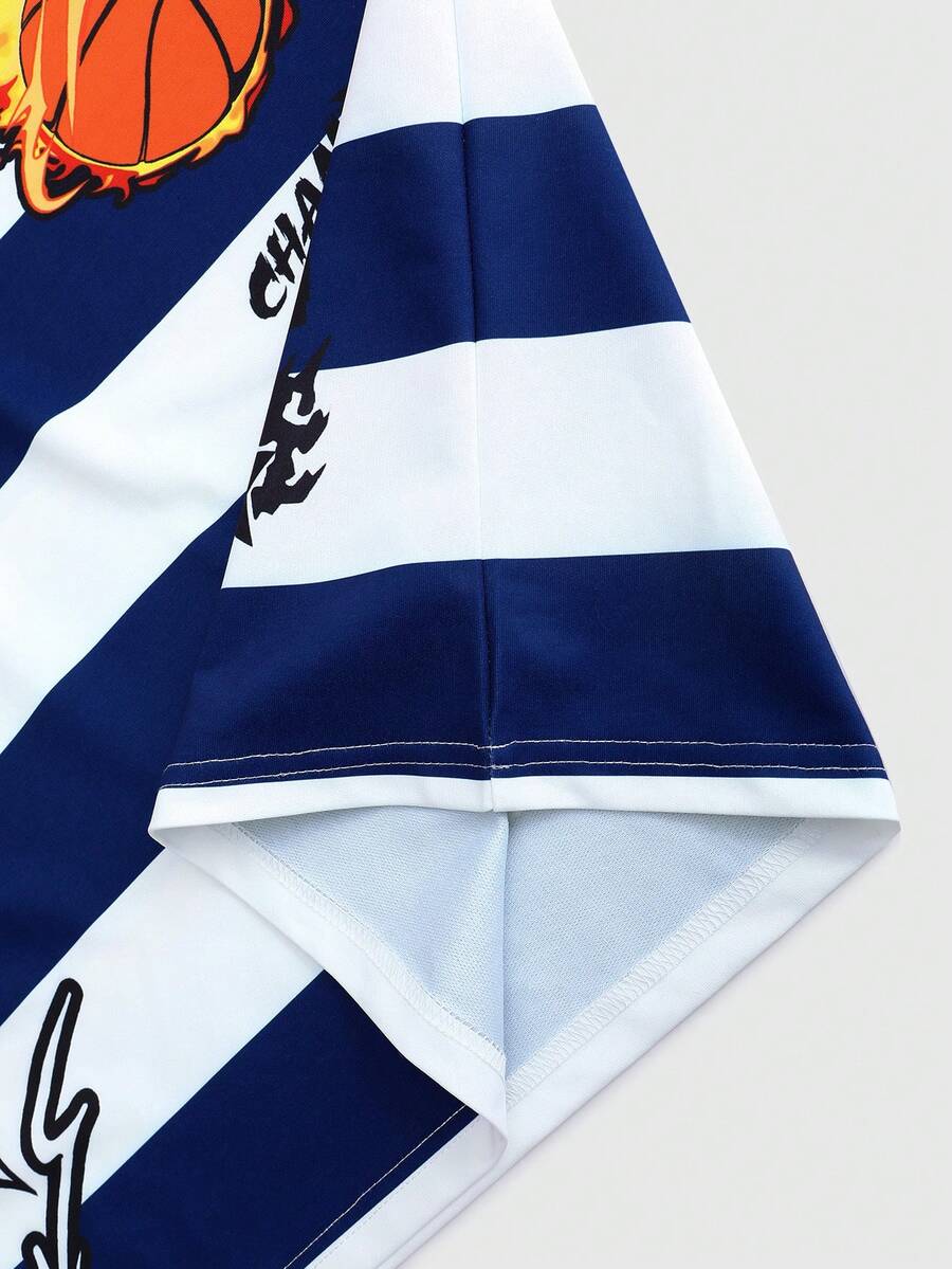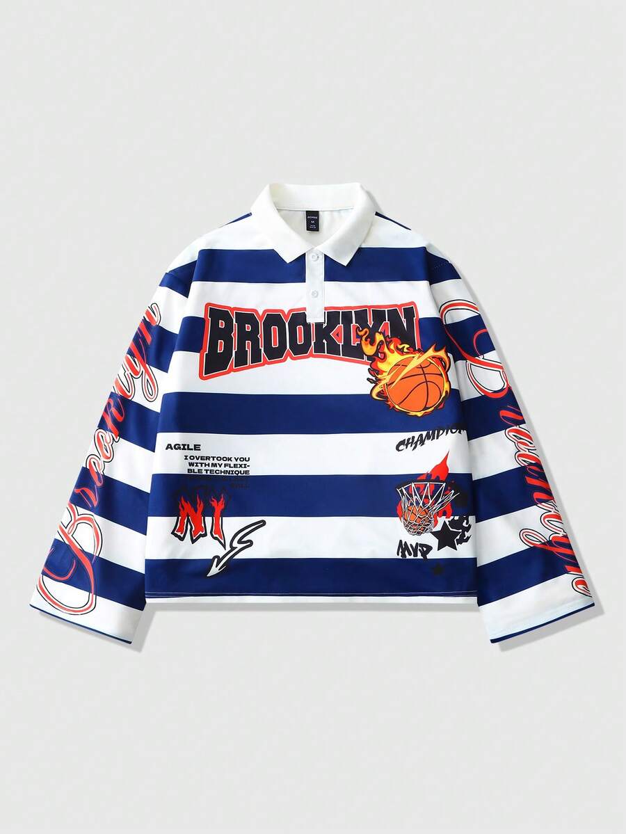 Prep Maglietta a maniche lunghe da uomo, a righe blu e bianche + stampa a fiamma da basket accattivante, design con colletto polo per uno stile raffinato, adatta per uso quotidiano e partite di basket, perfetta per gli appassionati di basket