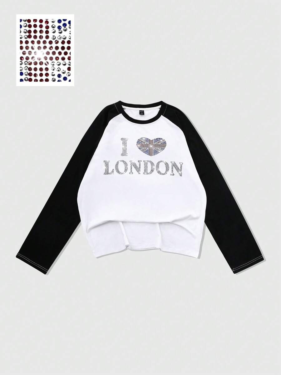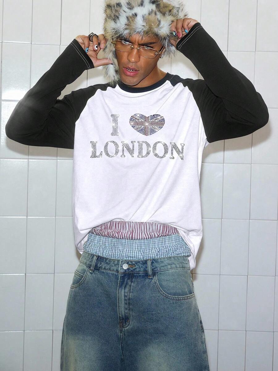 Maglietta a maniche lunghe da uomo con stampa di "I LONDON" in strass, adatta per uscite casual, raduni a tema britannico, che cattura uno stile britannico retrò