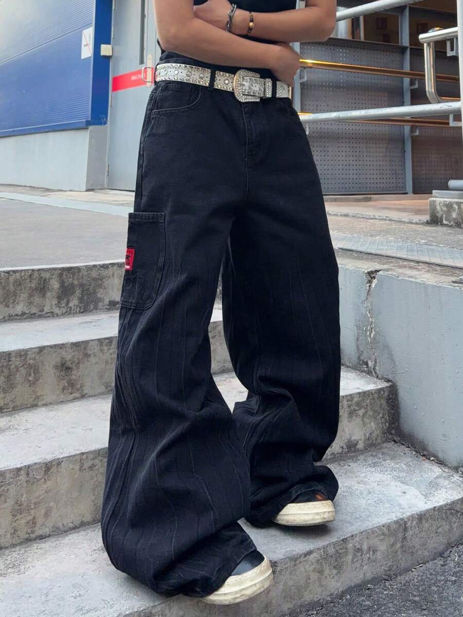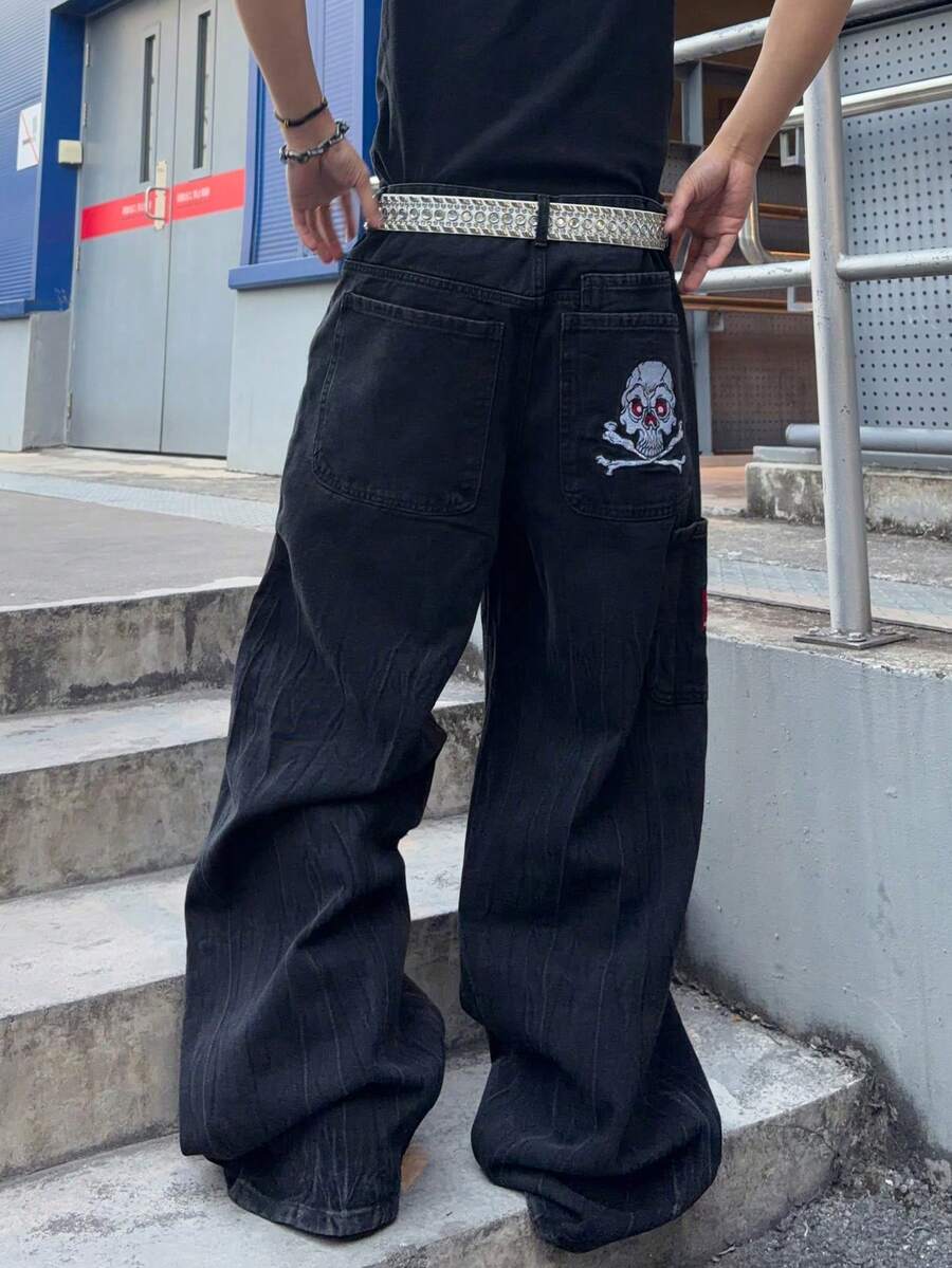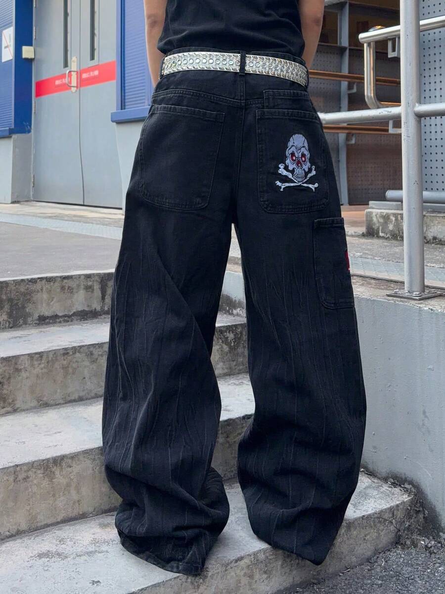 Jeans larghi da uomo con disegno ricamato a teschio