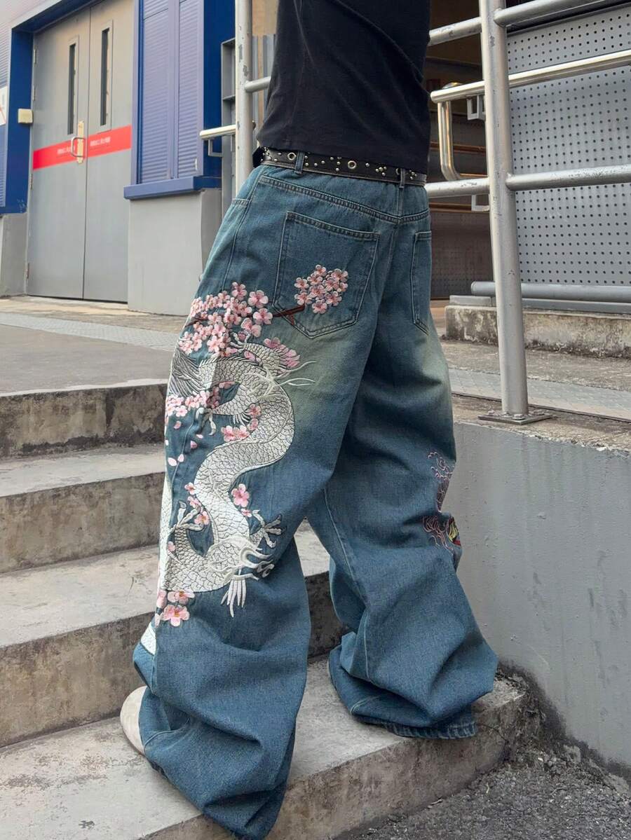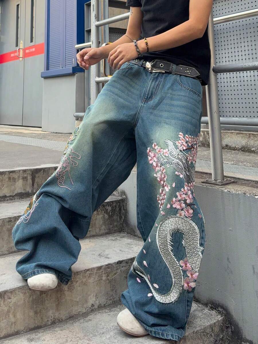 Jeans larghi con vestibilità ampia e ricamo di mostri sulla tasca, per uomo