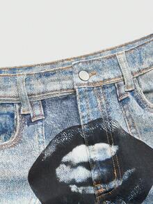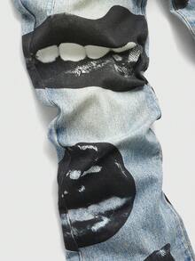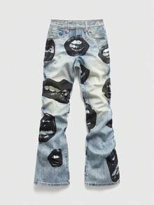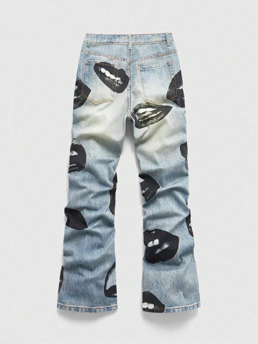 Jeans da uomo con tasche, a zampa d'elefante, con stampa a labbra e stretch