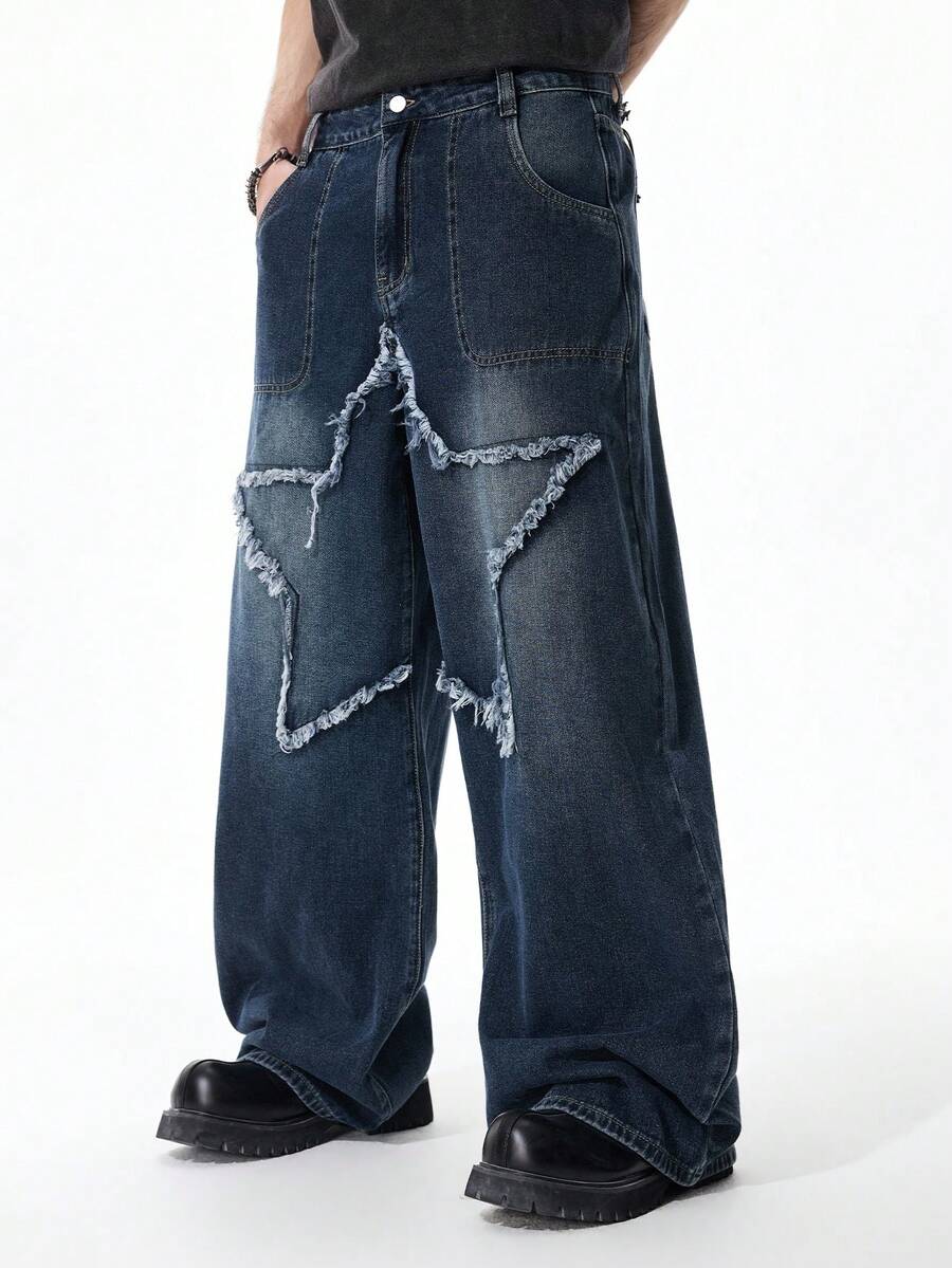 Jeans da uomo con gamba ampia, tasche, colore a contrasto, ricamo a stella a cinque punte personalizzato