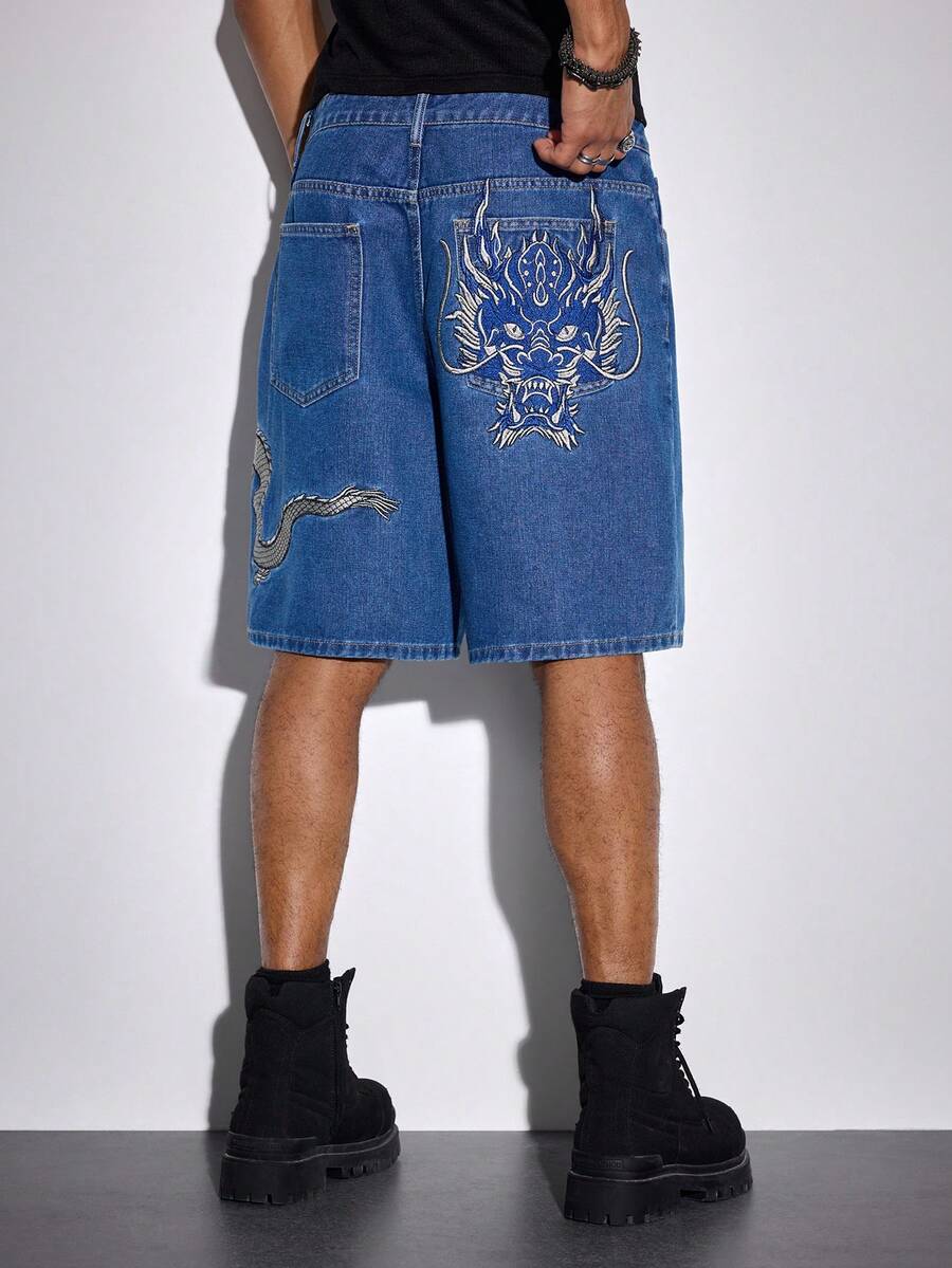 Pantaloncini di jeans casual estivi da uomo con tasche oblique e ricamo di dragone