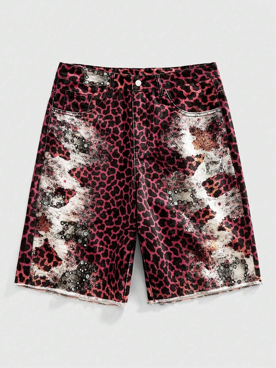 Pantaloncini di jeans casual da uomo per l'estate, con stampa digitale leopardata e tasche inclinate