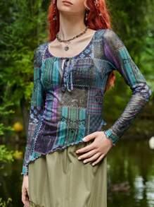 Top stampa patchwork con nodo frontale orlo lattuga mesh senza reggiseno