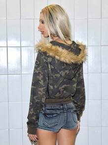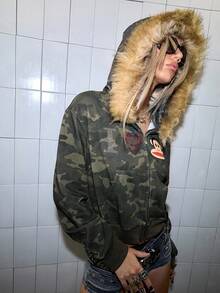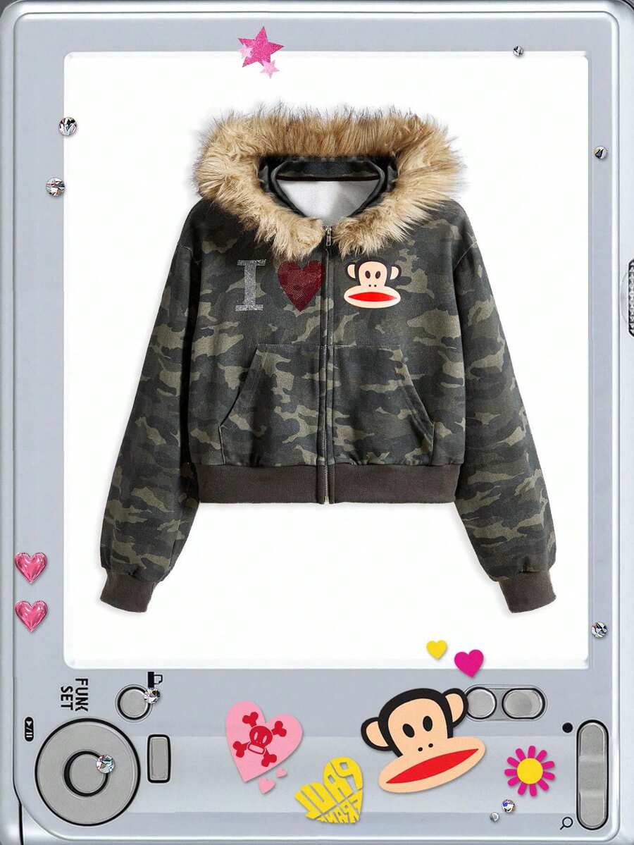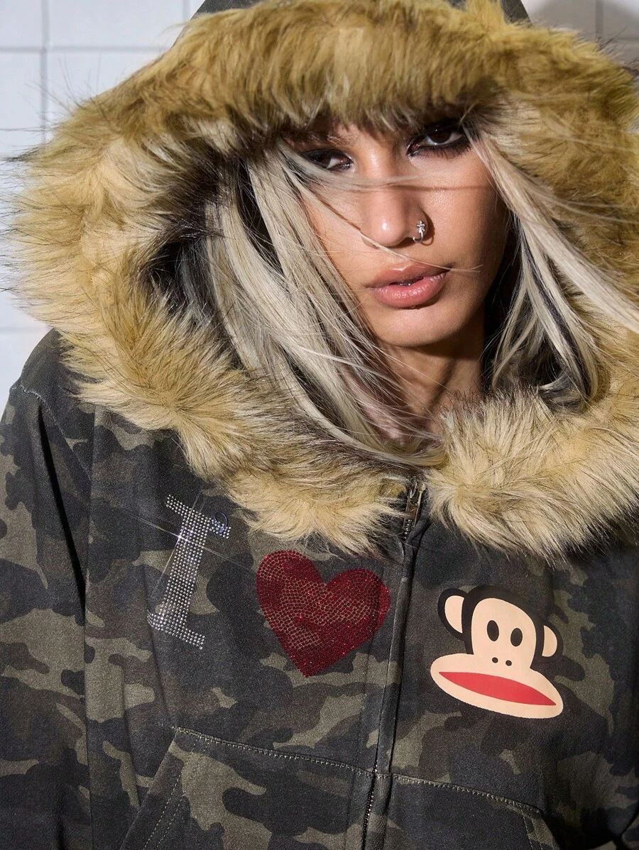 Paul Frank X ROMWE Felpa con cappuccio Y2K Kpop con motivo a cartone animato di scimmia, strass e bordo in pelliccia mimetica