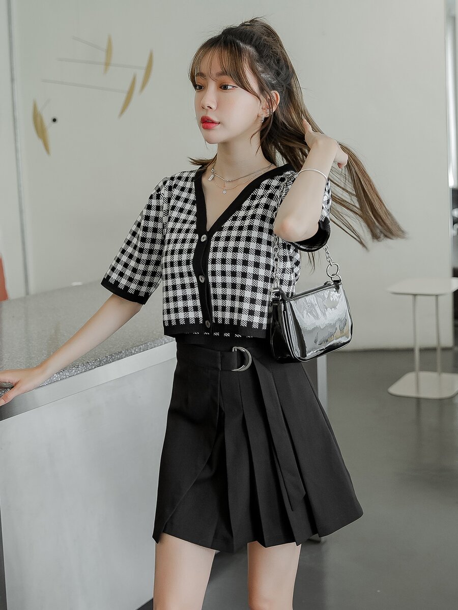Set cardigan con bottone & Top bretelle sottili a quadri