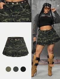 EDITION Minigonna in denim plissettata con catena a stella e tessuto mimetico, stile punk sexy, per taglie forti
