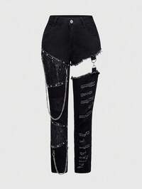 Grunge Punk Jeans skinny strappati e rovinati in denim con decorazione a catena di strass e di taglia grande, stile punk