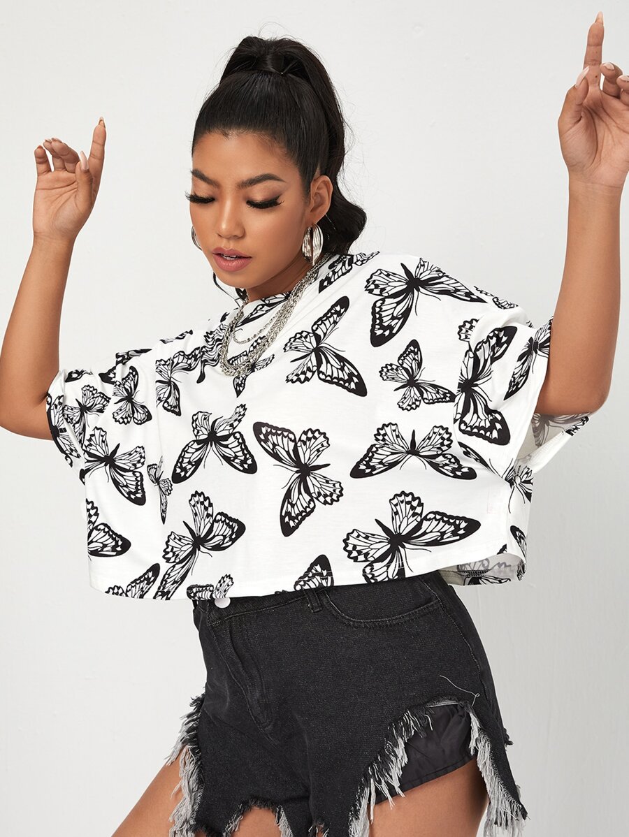 T-shirt estiva oversize con stampa a farfalle su tutto il capo