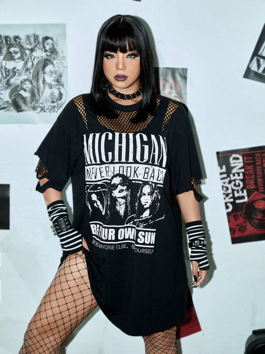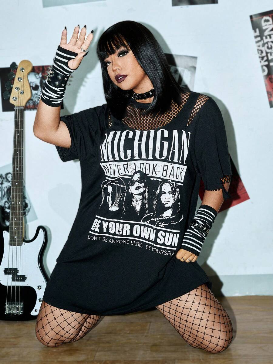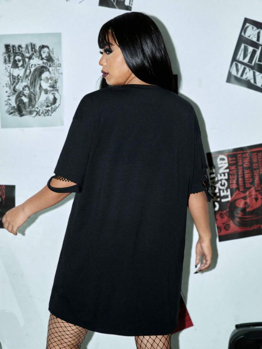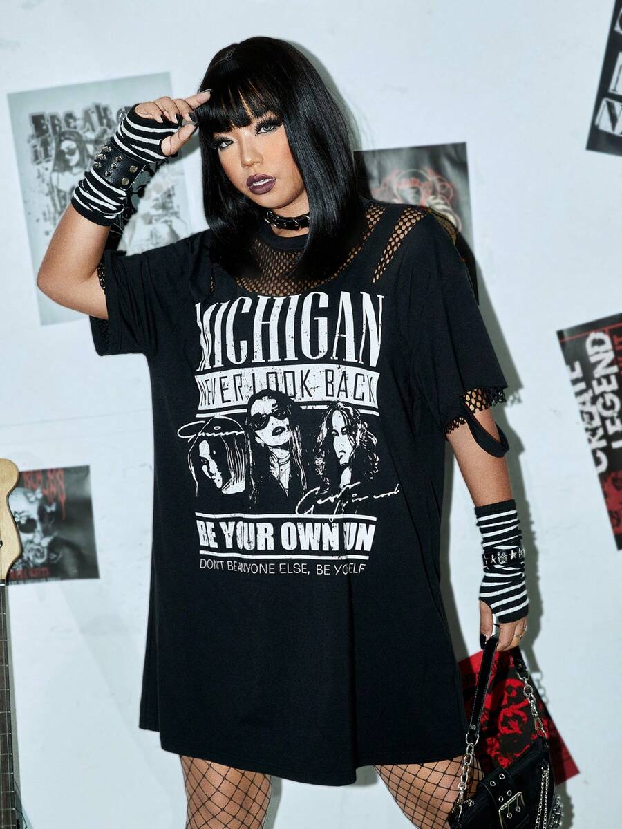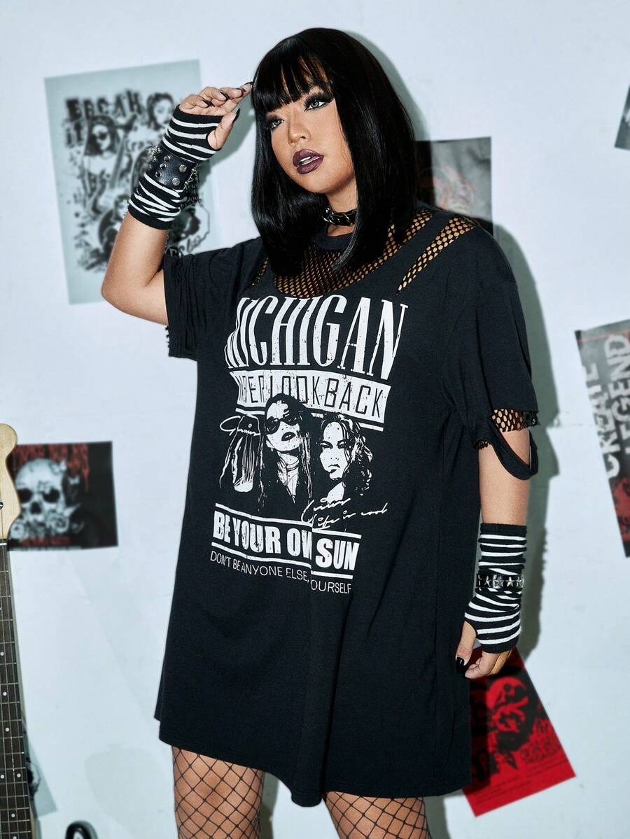 Taglie Forti Abito maglietta con spalle cadenti con grafica figura e slogan inserto in rete