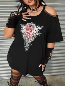 taglie forti Maglietta con spalla cadenti floreale & con stampa teschi scavato
