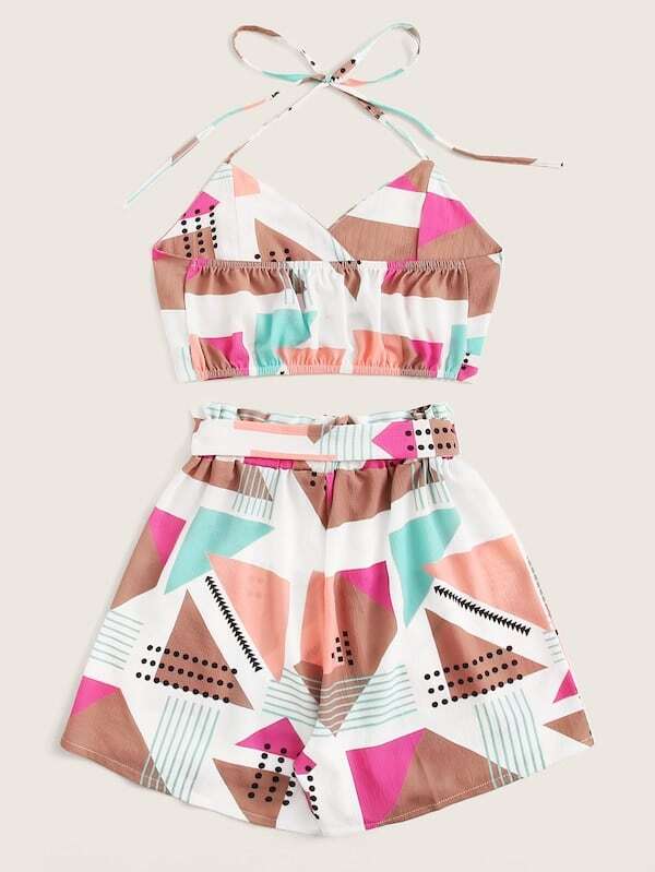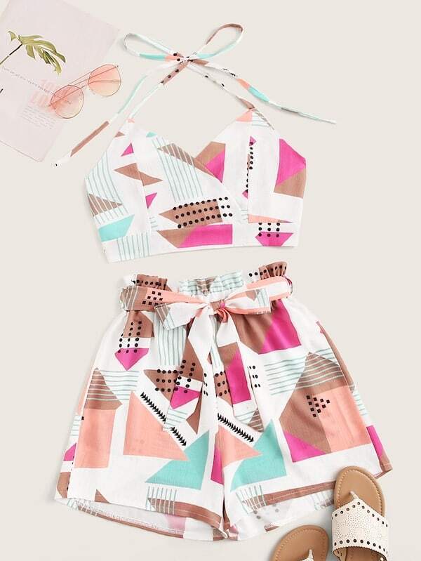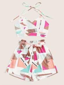 Top con bretelle sottile e stampa geo e Shorts con cinture taglie forti