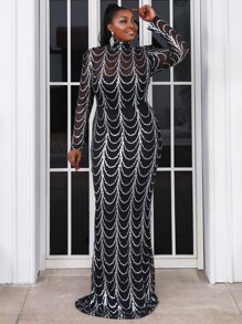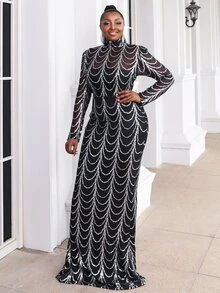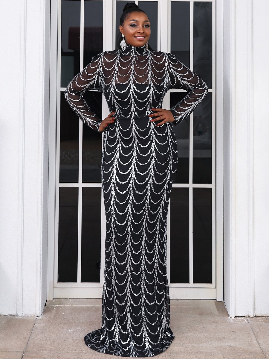 seomiscky Abito da sera nero lungo con collo alto, dettagli con paillettes, maniche lunghe, elegante, adatto per laurea, cena, eventi formali e matrimoni