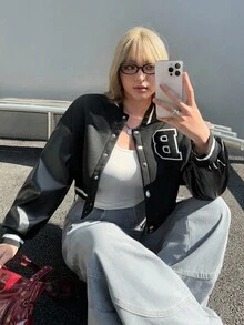 taglie forti Giacca bomber con toppa lettera finitura a righe spalle cadenti corto