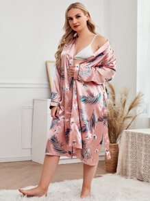 Vestaglia con cinture e stampa tropicale e gru in raso