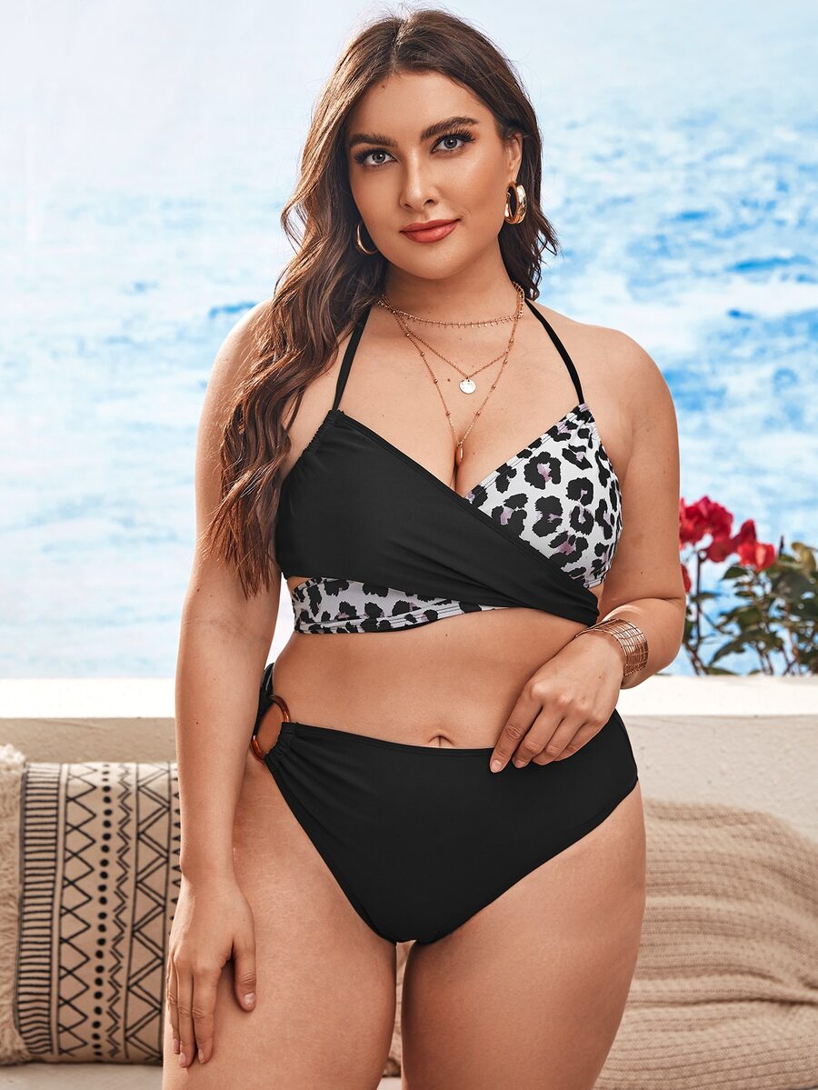 Costume da bagno a fascia incrociata in contrasto con motivo leopardato, misure forti, per l\'estate in spiaggia