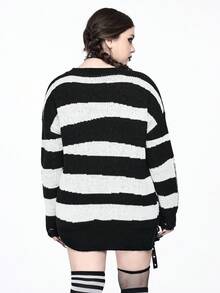 Goth Maglione oversize con orlo strappato a righe nere e bianche stile gotico, adatto per autunno/inverno. Maglione oversize casual a righe nere e bianche con patchwork, stile demone e mostro di Ognissanti e Natale, con dettagli in PU. Maglione oversize a righe nere e bianche. Maglione oversize da donna. Maglione oversize casual da donna in stile urban