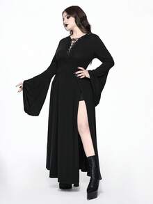 Goth Abito lungo con cappuccio in stile gotico oversize con collo annodato, maniche a sbuffo, decorazione con anelli metallici, spacchi laterali, abito lungo con cappuccio a maniche lunghe sexy, abito gotico oversize autunno/inverno, abito con cappuccio in maglia gotico sexy punk oversize