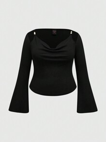 Maglietta a maniche a campana aderente con collo drappeggiato, stile hippie, taglie comode