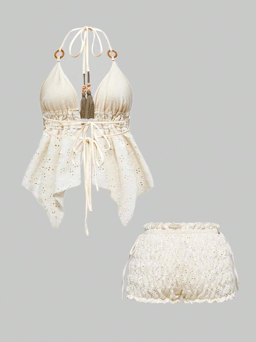 ROMWE Avant Set di 2 pezzi da donna taglie forti, stile vacanziero d'avanguardia Y2K, top canotta senza schienale con decorazione in perle di legno e pantaloncini a vita bassa a palloncino