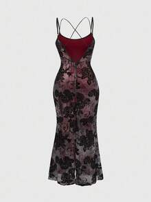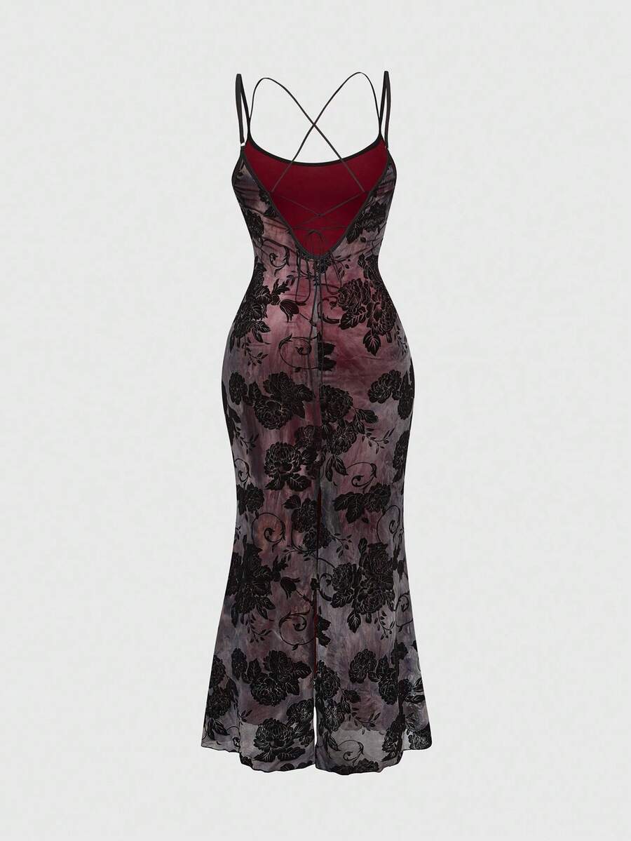 Goth Abito a sirena con vita aderente, retro, con motivo floreale floccato e schiena scoperta, taglie comode