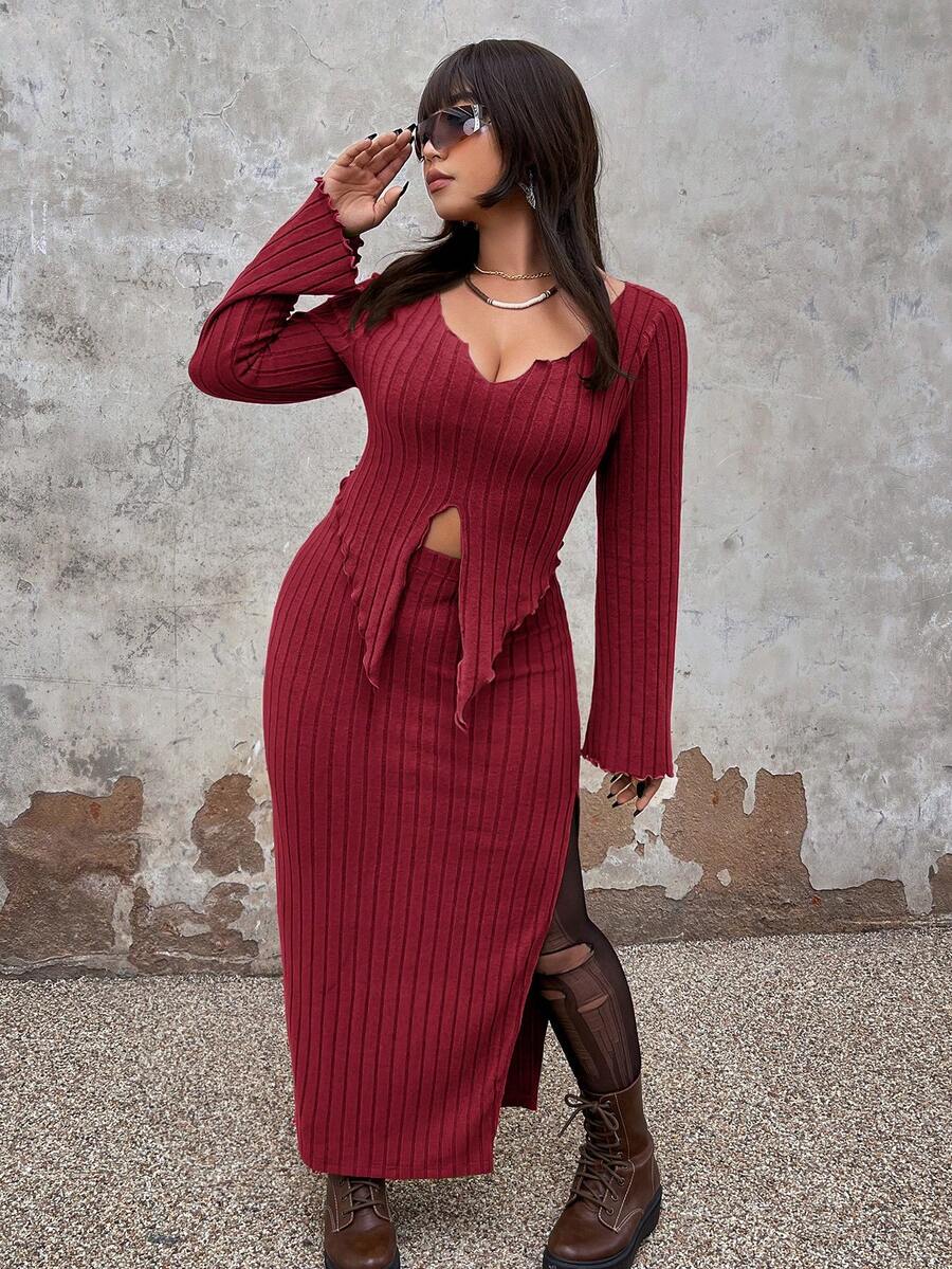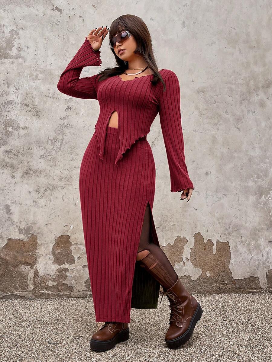 Set Da Due Pezzi In Maglia A Coste Tinta Unita Taglie Forti