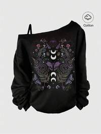 Goth Maglietta a maniche lunghe con stampa gotica di farfalle, sole e funghi, scollo obliquo, per taglie forti, felpa con grafica autunnale per donne taglie forti, casual, scollo obliquo, maniche lunghe, adatta per pendolarismo, ritorno a scuola, uso quotidiano
