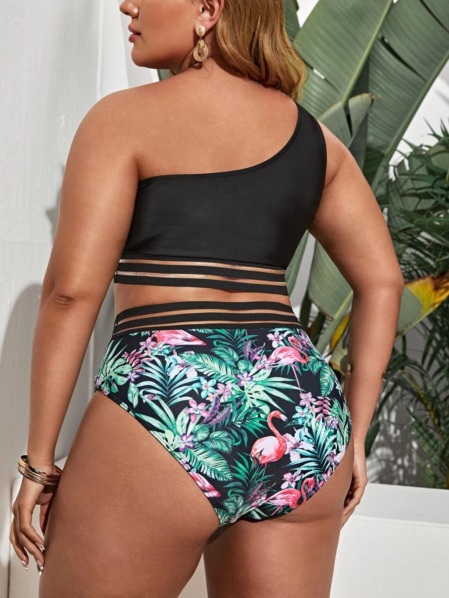 Bikini a fantasia tropicale con inserto in rete a contrasto, taglie forti, da spiaggia estiva