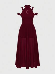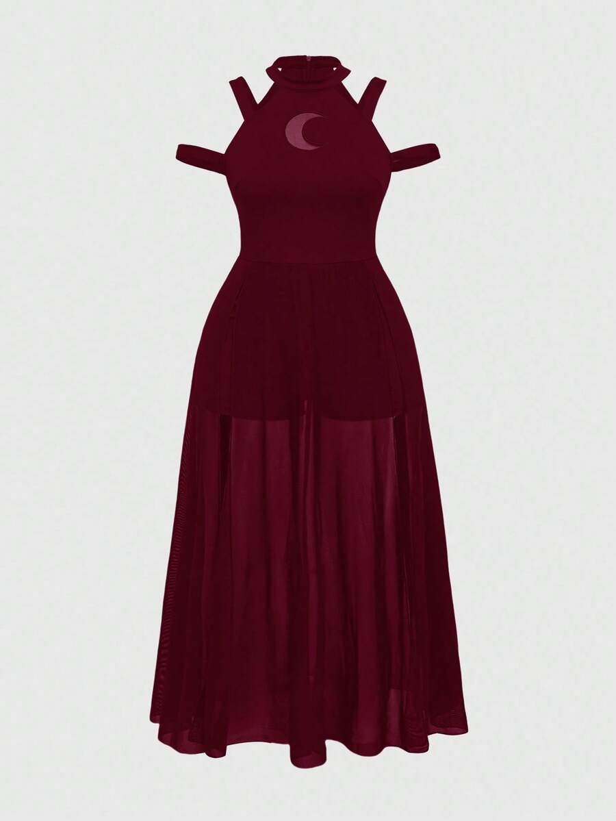 Goth Abito da donna taglie forti stile gotico, con dettagli in rete e luna cava, scollo spalle scoperte, colore bordeaux
