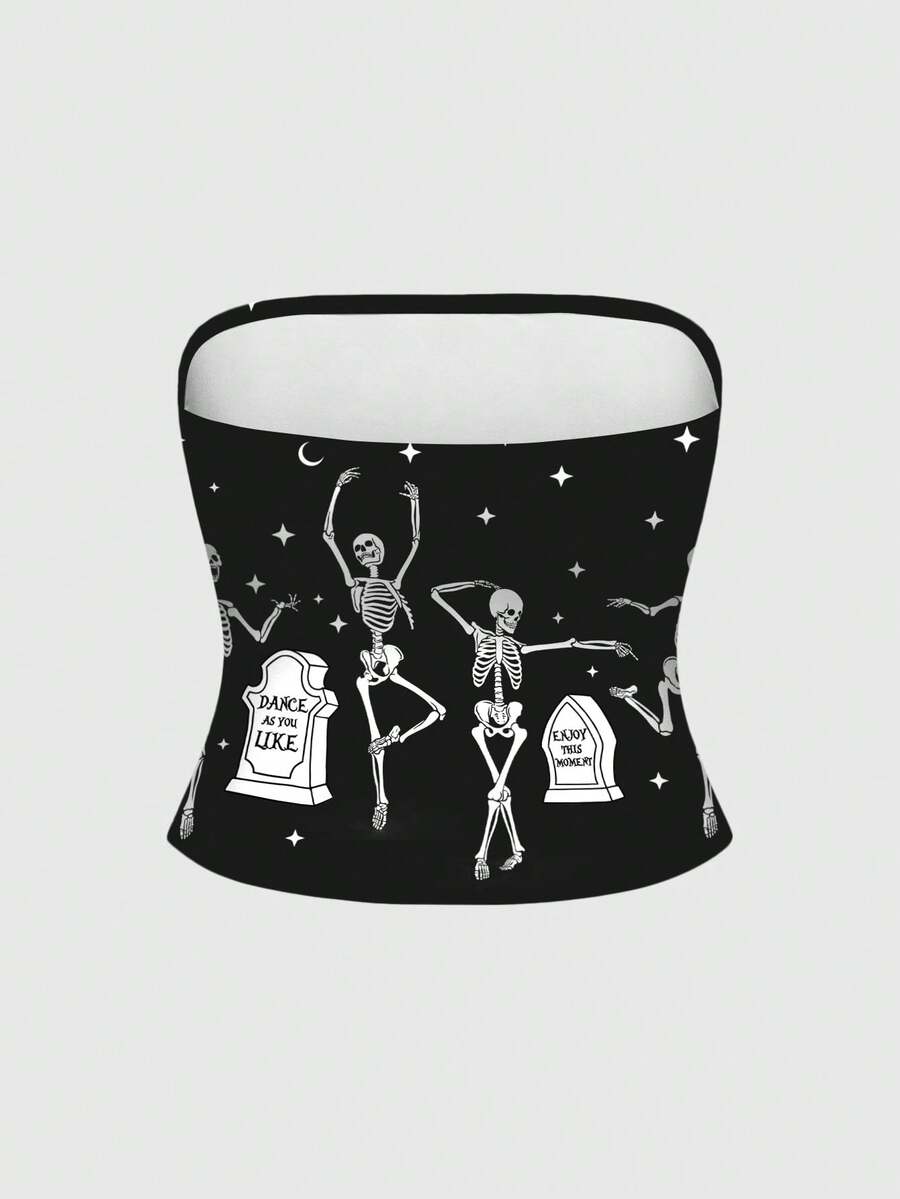 Goth Crop top nero e bianco da donna taglie forti, con stampa divertente e misteriosa di scheletro da ballo in stile gotico