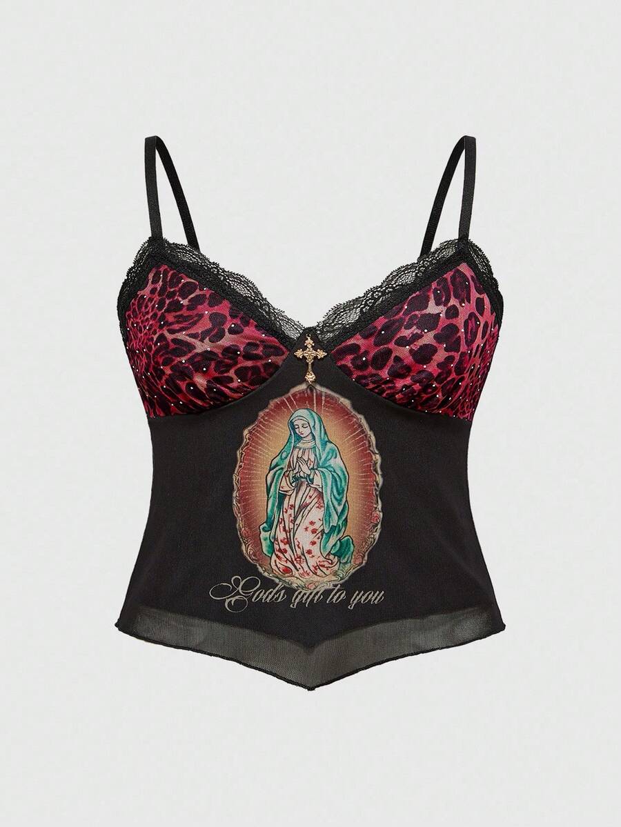 Fairycore Canotta in pizzo con stampa leopardata e strass, stile Y2K, taglie comode