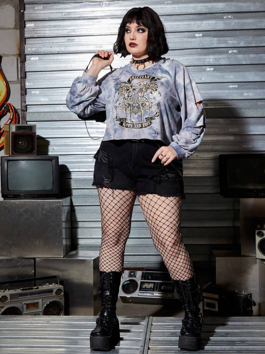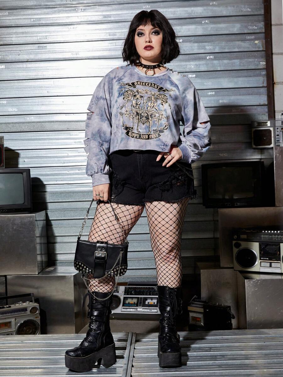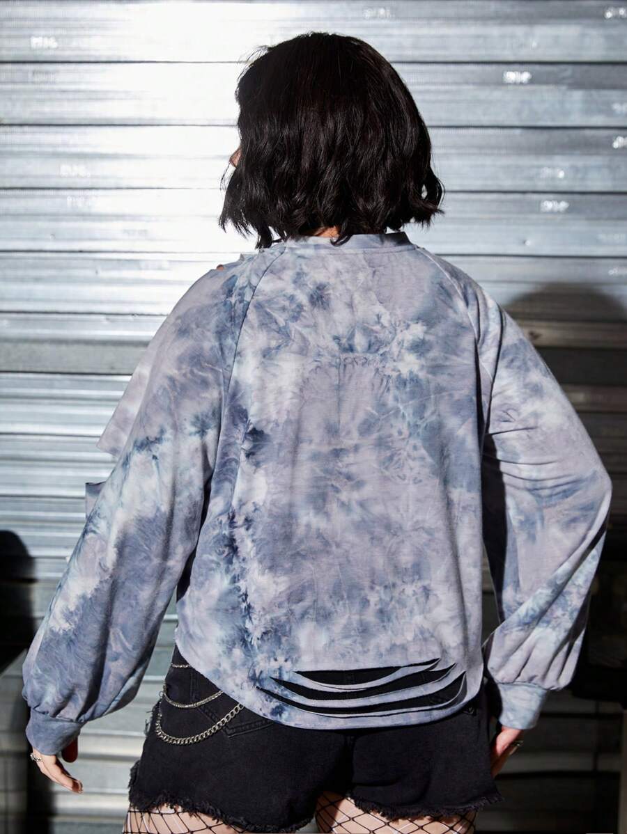 Taglie Forti Pullover tie dye lettere & con stampa teschi con strappati spalle cadenti