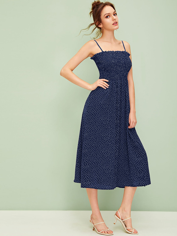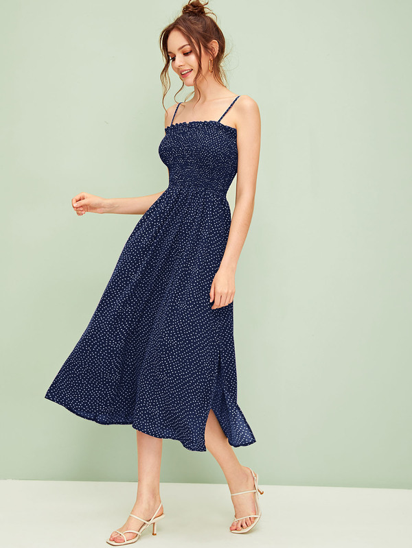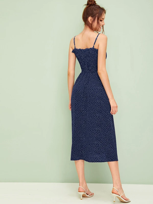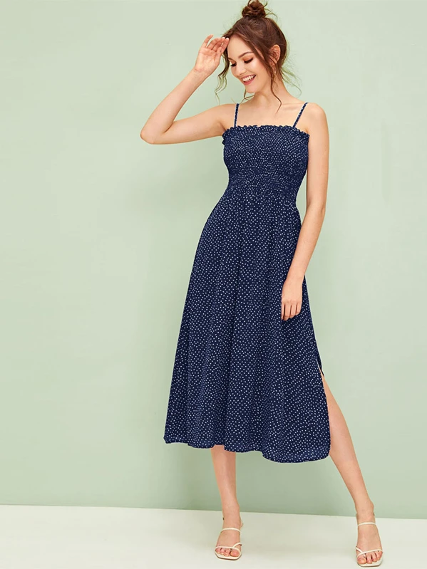 Abito a pois arricciato con bretelle sottili e orlo a fessura