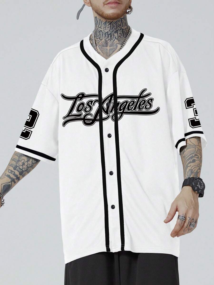 Prep Maglietta baseball a maniche corte da uomo, con bordi a contrasto e stampa di lettere, adatta per la scuola