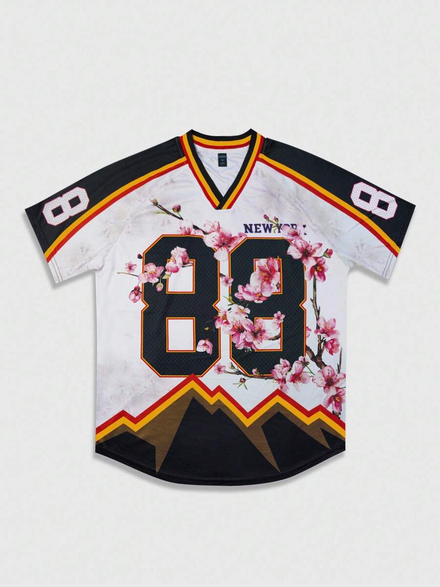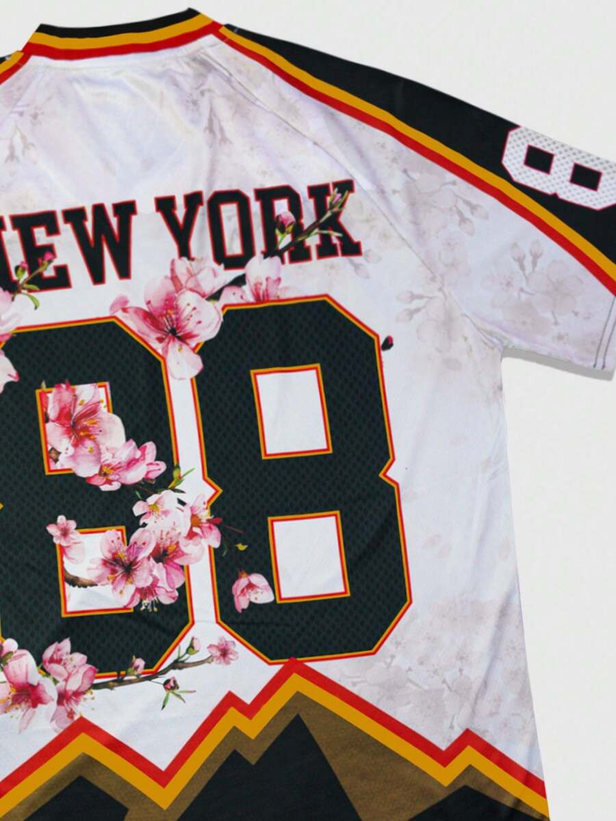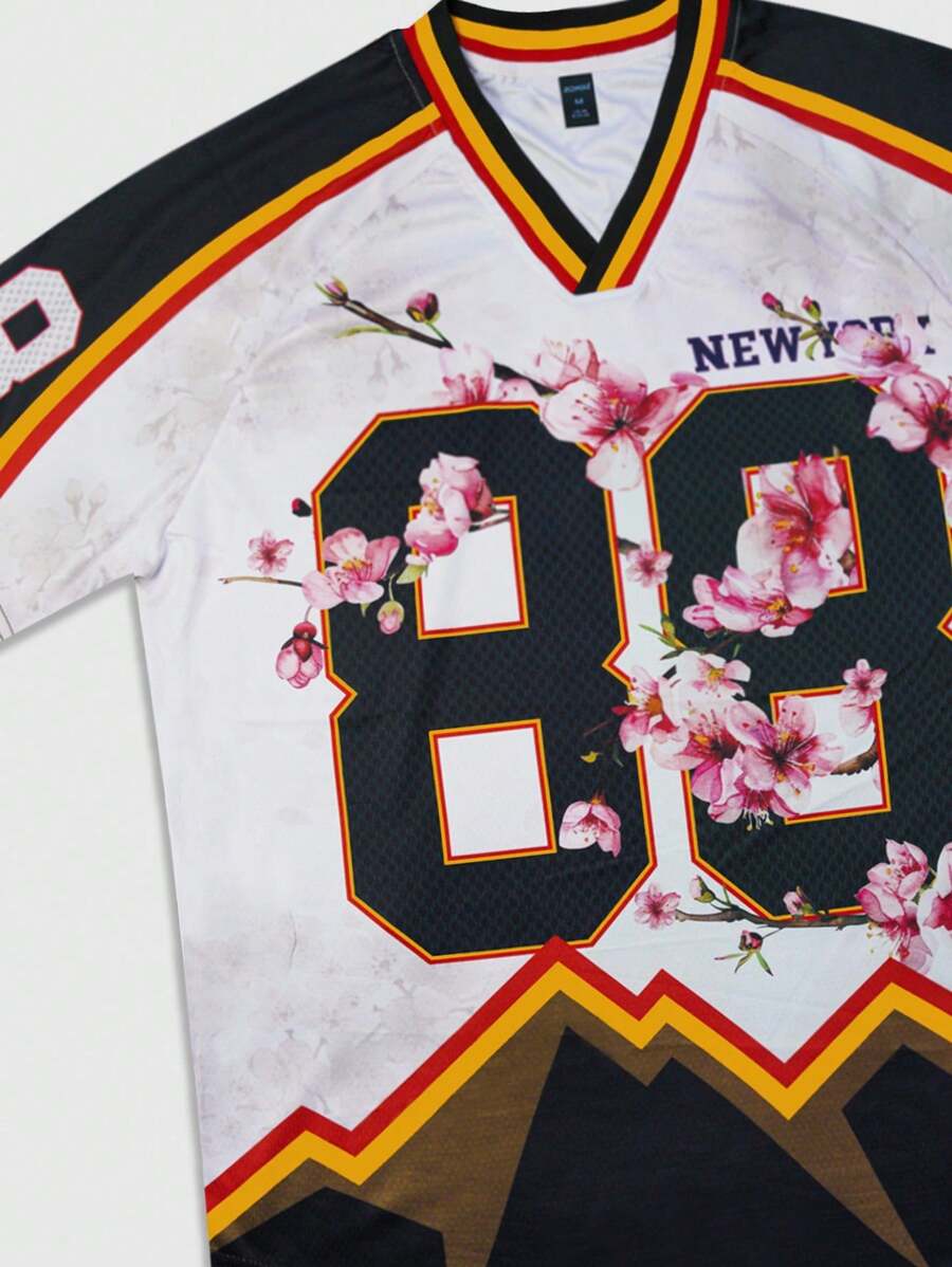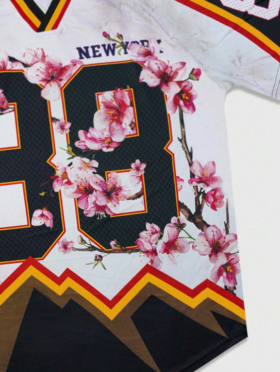 Prep Maglietta da hockey su ghiaccio con stampa di numeri e fiori di ciliegio, con dettagli a righe in contrasto, adatta per uso quotidiano in primavera e estate